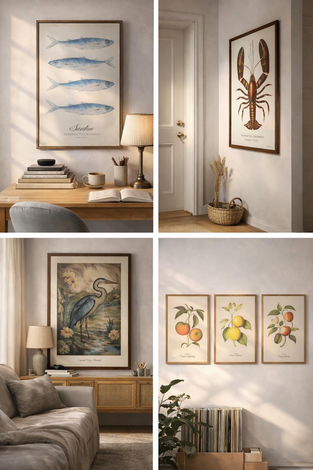 Many rentals lack personality. Especially living rooms. Marine and coastal illustrations (lobsters, sardines, botanicals) introduce lightness and charm without needing to touch the walls themselves.