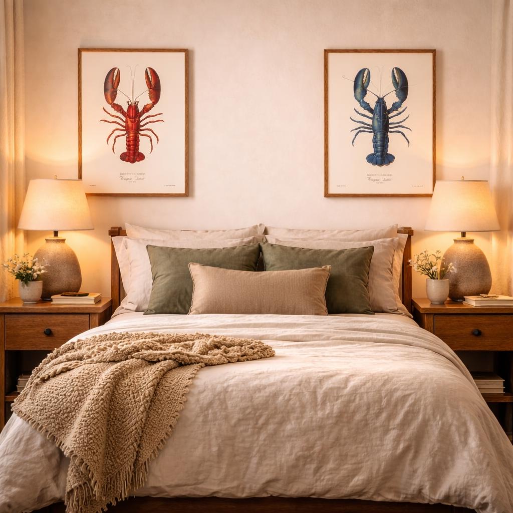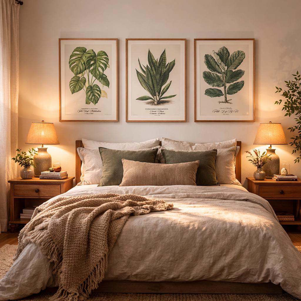 Linen bedding. Soft throws. Wooden bedside lamps. The artwork should echo this texture (natural frames, warm tones, organic subject matter). When bedrooms feel edited and warm, sleep comes easier.