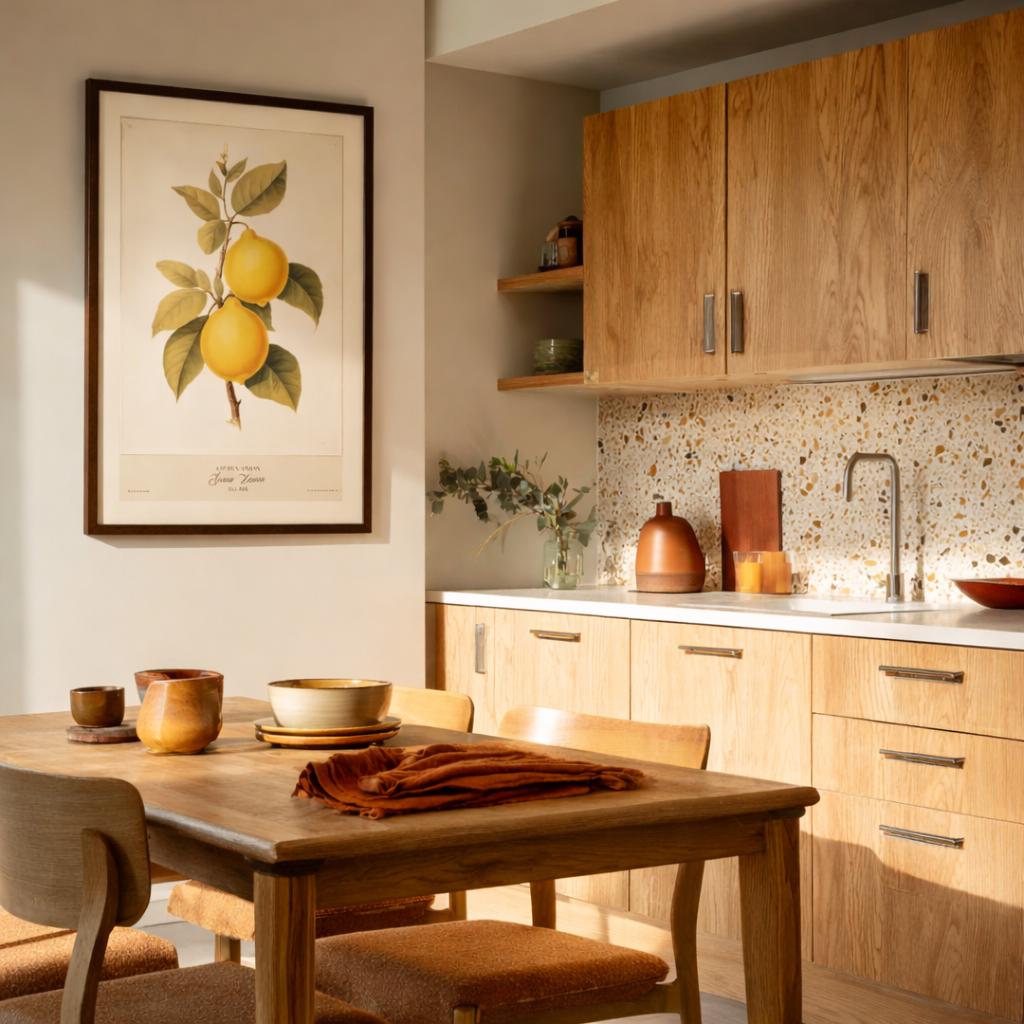 Pull one or two tones from the print and echo them in small details: a tea towel, a stool cushion, a ceramic bowl. Wood tones do most of the heavy lifting. Keep cabinetry simple. Let lighting stay warm.