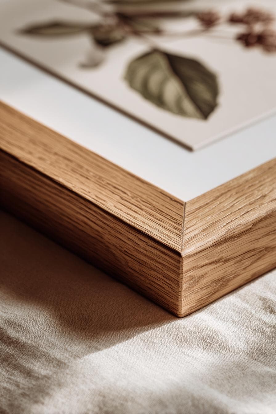 Wood frames bring warmth immediately. Oak, walnut and lighter natural finishes soften a room and work beautifully with botanical prints, coastal artwork, and vintage-inspired illustrations. They feel timeless. Lived-in. Considered. Wood is especially effective in spaces that already carry natural texture — linen sofas, woven rugs, warm-toned furniture.