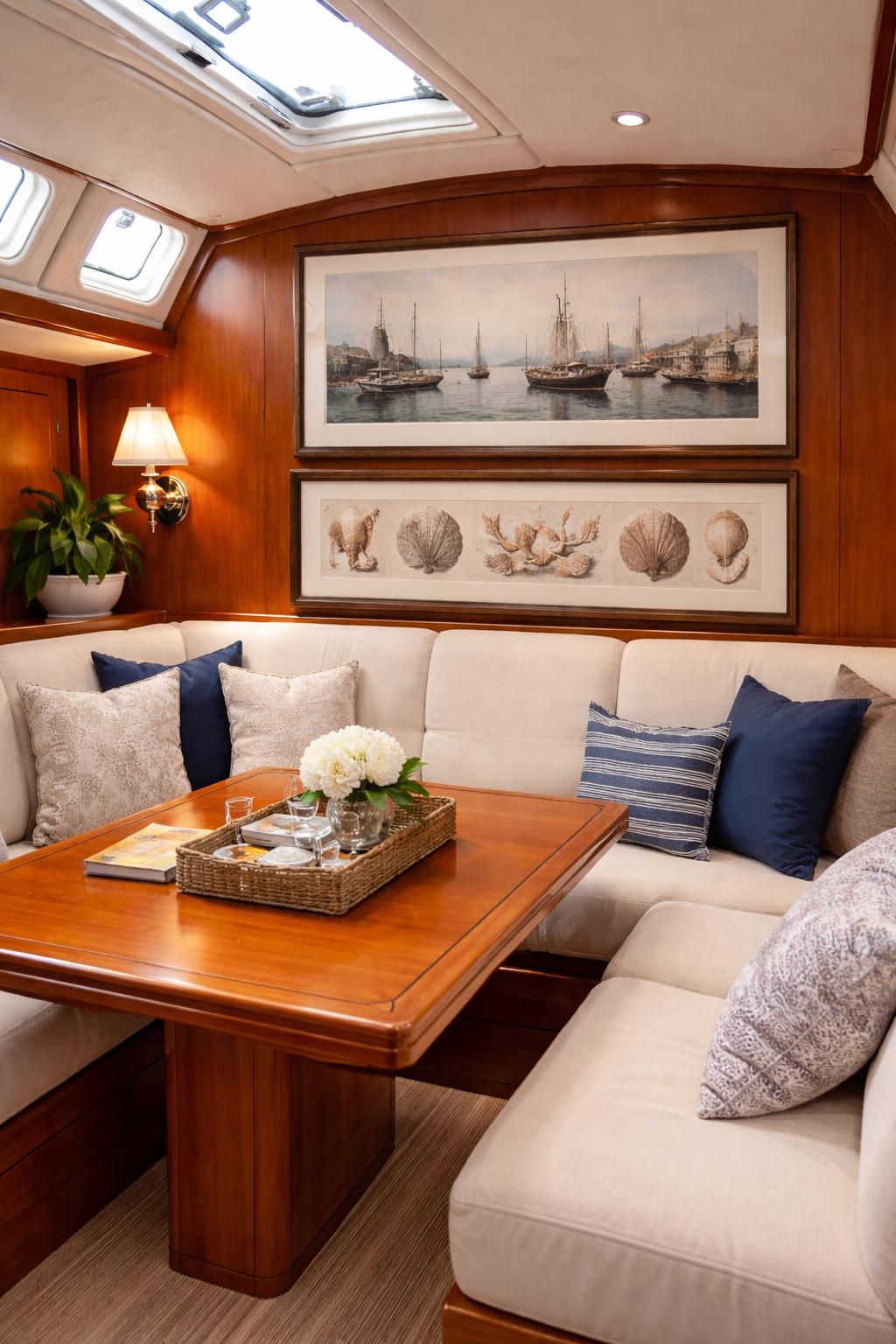 Space on sailing yachts is always limited, so proportion is everything. We often find that slightly smaller framed pieces work better than large statement works. A pair of medium prints or a vertical set of naturalist studies can add interest without overwhelming the space. Panoramic artwork can also work beautifully along the longer walls often found above seating areas. The key is to let the art complement the interior rather than dominate it.